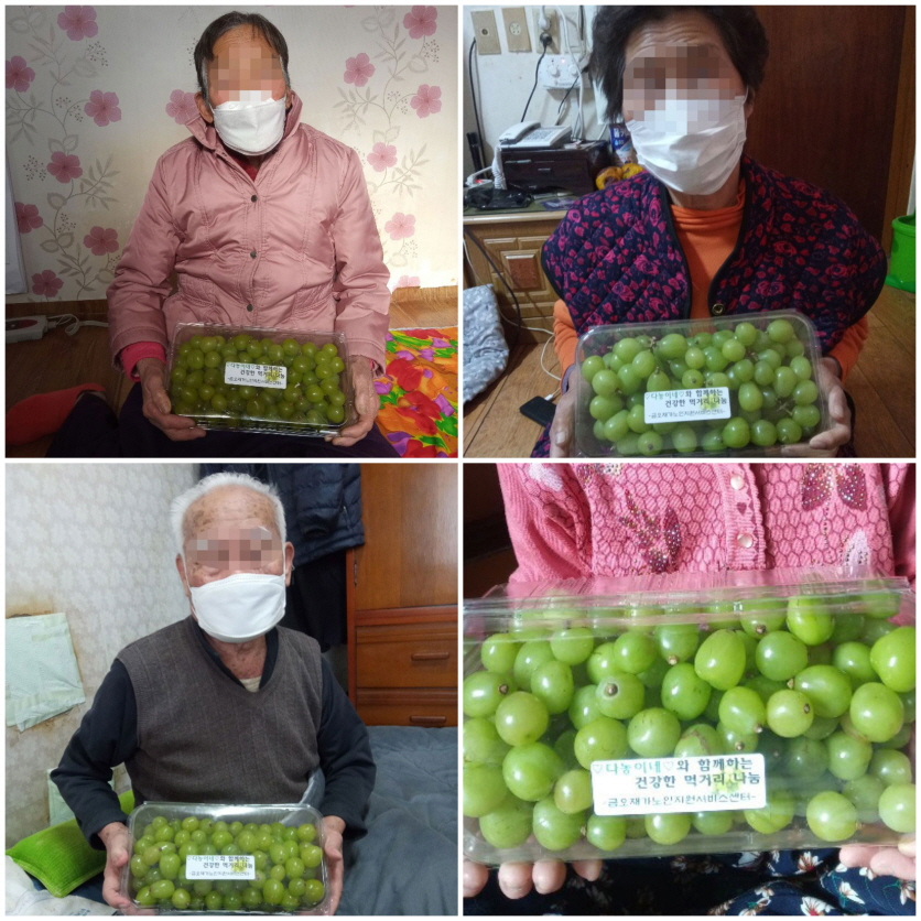 올해도 1월15~1월27일 사이 3회에 걸처 저희 센터 후원처인 다농이네에서 샤인머스켓 포도를 후원해 주셨습니다. 코로나와 추운 날씨 탓에 사회적관계 단절로 위축되어 있는 어르신들에게 겨울철 귀한 과일로 영양 공급은 물론 따뜻한 마음전달로 정서지원도 이루어 졌습니다.