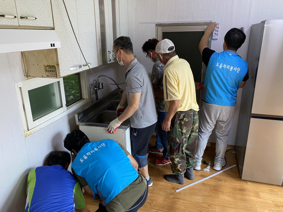 어르신께서 한번 장판 교체하기 위해 견적을 본적이 있었다고 하셨습니다. 그때 장롱이 무거워 안까지는 못한다고 하였으나 우리의 슈퍼맨 도움자리에서는 장롱을 통째로 옮겨 안까지 도배와 장판 교체를 하였습니다. 거기서 멈추지 않고 조립식 주택으로 삭거나 틈이 생긴 곳 에 실리콘 처리, 오래된 콘센트 교체, 서랍장 손잡이 교체등 다방면에 힘써주셨습니다. 어르신께서는“고마워, 왜 이렇게 잘 하는거야! 전문가라면서 박수 치며 좋아하셨습니다” 그래서 봉사에 귀재라고 하며 못 하는거 하나 없다고 하니 웃으셨습니다. 어르신께서 대접할게 하나 없다며 미안해 하셨지만 도움자리봉사자분들께서는 한마음 한뜻으로 어르신이 좋아 하시면 된다고, 보람차서 더 뜻깊었다고 하셨습니다.