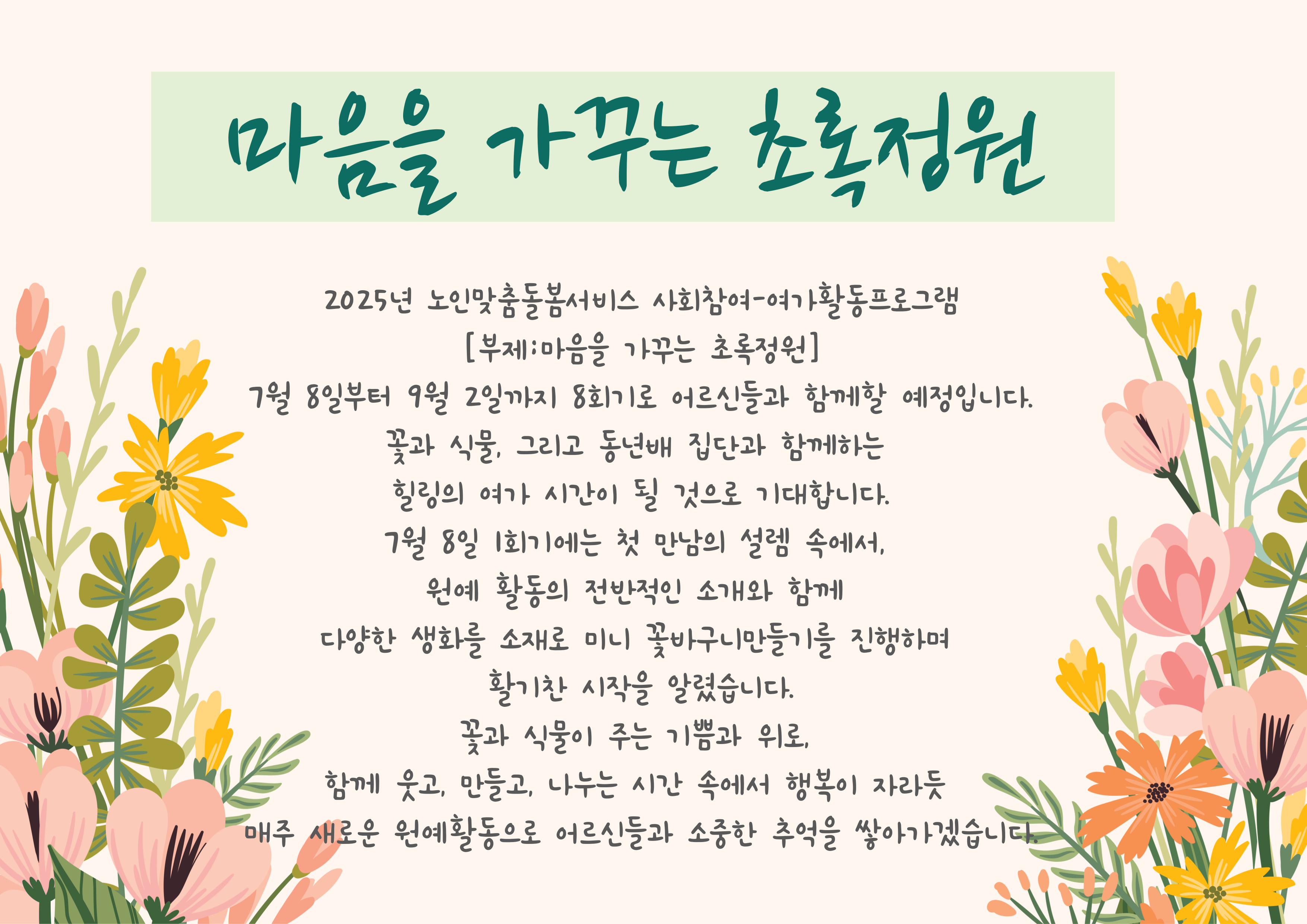 노인맞춤돌봄 #여가활동#원예활동프로그램#마음을 가꾸는 초록정원 페이지 정보 작성자 관리자 댓글 0건 조회 455회 작성일 25-07-15 18:22 목록 본문 이전글7월 금오시티투어-대형마트 탐방 25.07.15 다음글우울예방프로그램-스프링모스리스 및 드림캐처 만들기 25.07.03 댓글 0 댓글목록 등록된 댓글이 없습니다.