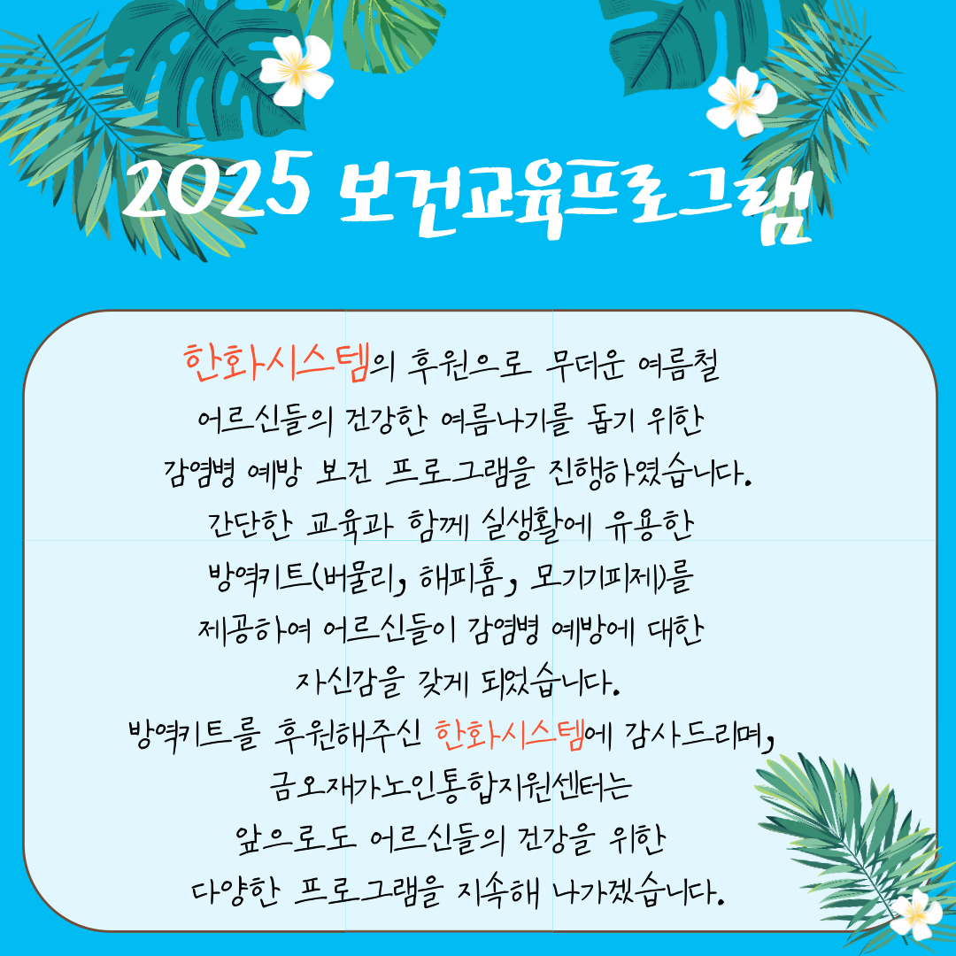 노인맞춤돌봄 2025년 보건교육프로그램 페이지 정보 작성자 관리자 댓글 0건 조회 473회 작성일 25-08-07 17:25 목록 게시판 리스트 옵션 검색 본문 이전글2025년 희망잇는 나눔 의류지원 사업[독고노인종합지원센터·굿네이버스] 25.08.08 다음글#여가활동#원예활동프로그램#마음을 가꾸는 초록정원 25.07.15 댓글 0 댓글목록 등록된 댓글이 없습니다.