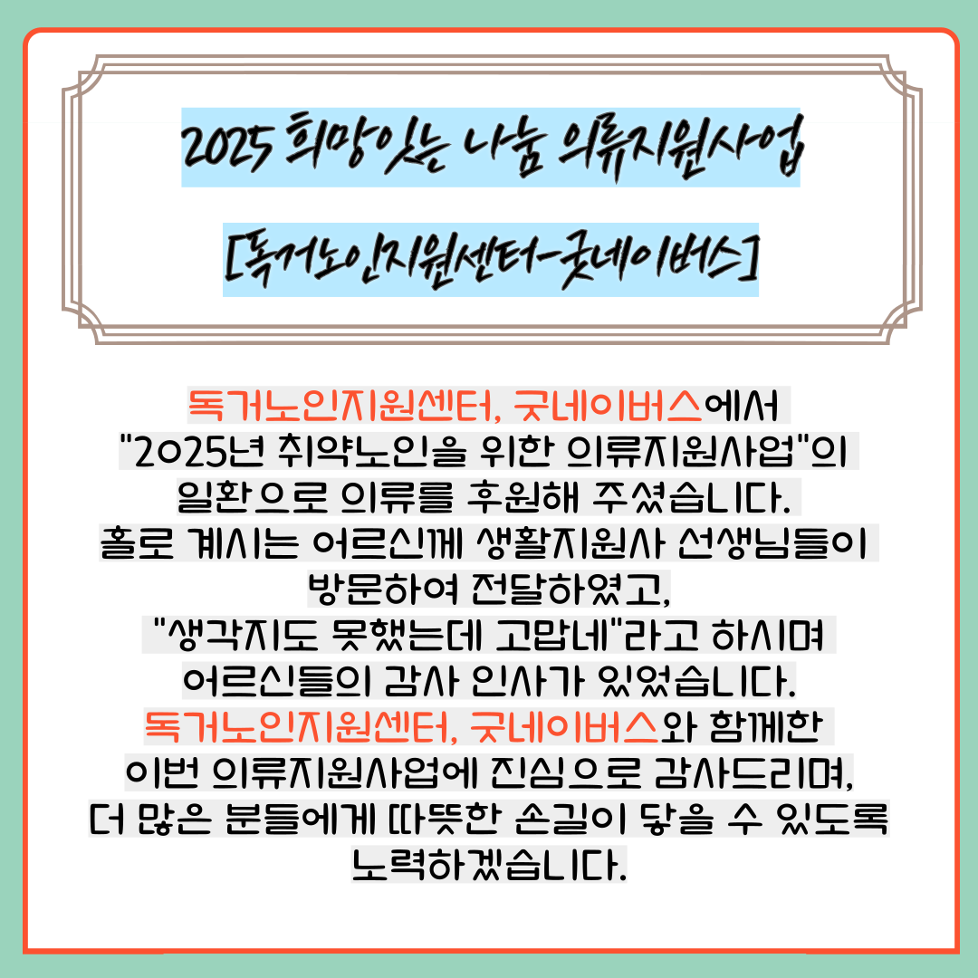 노인맞춤돌봄 2025년 희망잇는 나눔 의류지원 사업[독고노인종합지원센터·굿네이버스] 페이지 정보 작성자 관리자 댓글 0건 조회 513회 작성일 25-08-08 08:58 목록 게시판 리스트 옵션 검색 본문 이전글한국수자원공사 추석맞이 쌀 나눔전달식 25.09.29 다음글2025년 보건교육프로그램 25.08.07 댓글 0 댓글목록 등록된 댓글이 없습니다.