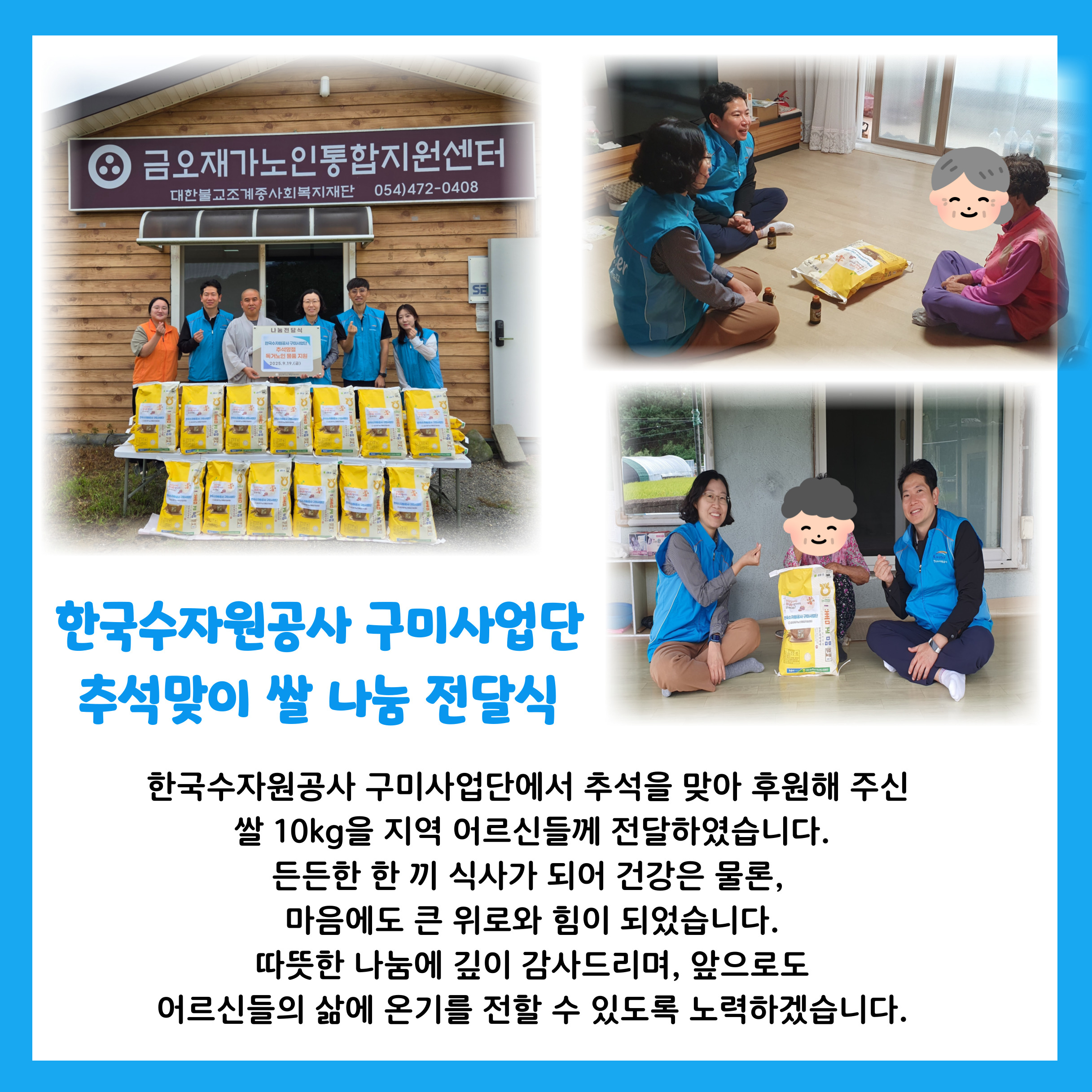 노인맞춤돌봄 한국수자원공사 추석맞이 쌀 나눔전달식 페이지 정보 작성자 관리자 댓글 0건 조회 337회 작성일 25-09-29 15:36 목록 본문 이전글신한라이프와 함께하는 사랑잇는전화 '행복나눔 키트 지원사업' 25.09.30 다음글#9월 20일 #구미사회복지사의날 '복지서비스전' 25.09.26 댓글 0 댓글목록 등록된 댓글이 없습니다.
