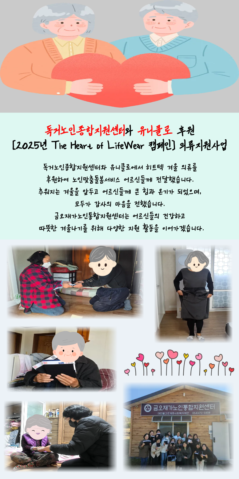 노인맞춤돌봄 2025년 유니클로와 함께하는 The Heart of LifeWear 캠페인 의류지원사업 페이지 정보 작성자 관리자 댓글 0건 조회 143회 작성일 25-11-25 08:58 목록 본문 이전글#11월 LG전자노동조합 구미지부 “든든한 발걸음, 사랑의 실버카” 전달식 25.11.26 다음글2025년 보건교육프로그램-구급약세트 활용 25.11.14 댓글 0 댓글목록 등록된 댓글이 없습니다.