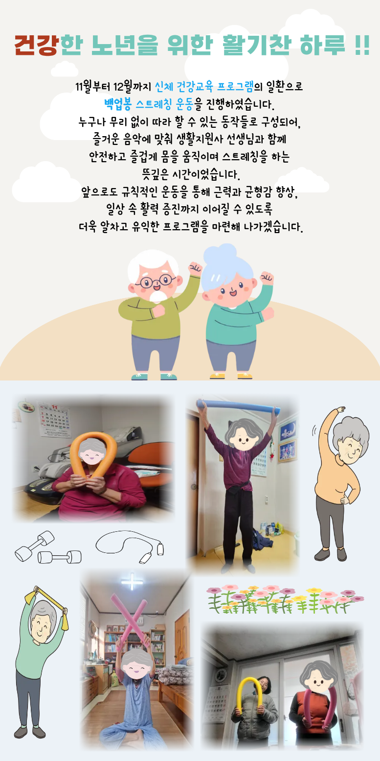 노인맞춤돌봄 신체건강프로그램-백업봉 스트레칭 페이지 정보 작성자 관리자 댓글 0건 조회 62회 작성일 25-12-11 17:30 목록 본문 다음글신라불교 초전지에서의 특별한 하루 25.12.09 댓글 0 댓글목록 등록된 댓글이 없습니다.
