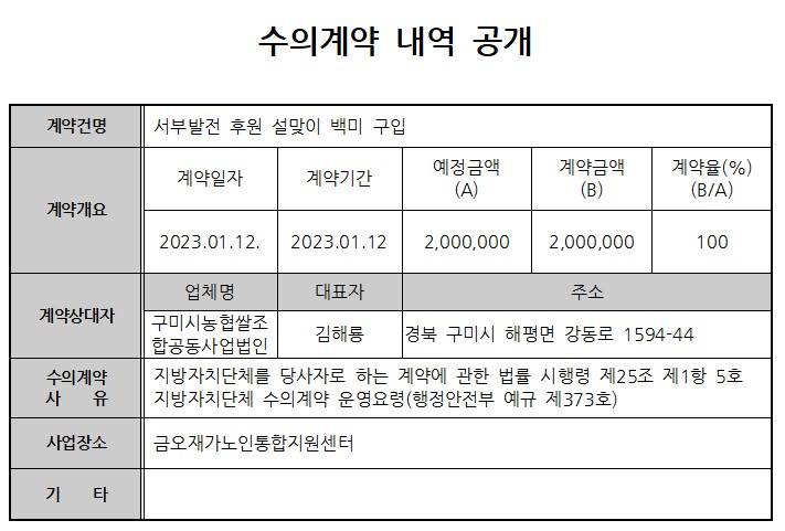 한국서부발전 후원 설맞이 물품구입 업체 선정 수의계약 내역 공개 페이지 정보 작성자 관리자 댓글 0건 조회 3,369회 작성일 23-01-13 10:54 목록 본문 한국서부발전 후원 설맞이 물품구입 업체 선정 수의계약 내역 공개 이전글노인맞춤돌봄서비스 생활지원사 채용 공고(마감) 23.02.07 다음글1월 수의계약 내역 공개 23.01.11 댓글 0 댓글목록 등록된 댓글이 없습니다.