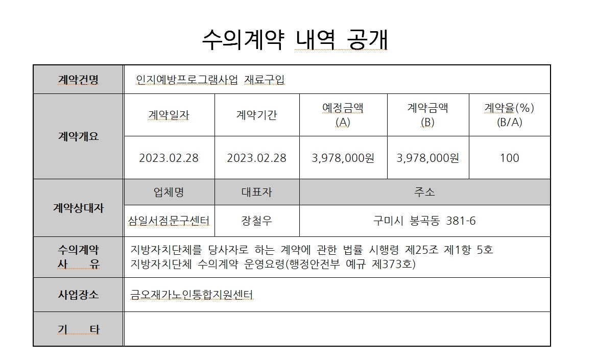 노인맞춤돌봄서비스사업 수의계약 내역 공개 페이지 정보 작성자 관리자 댓글 0건 조회 3,502회 작성일 23-03-06 16:20 목록 본문 수의계약 내역 이전글재가노인지원서비스 사회복지사 채용 공고(마감) 23.04.24 다음글한화시스템 후원 밑반찬지원사업 수의계약 내역 공개 23.02.13 댓글 0 댓글목록 등록된 댓글이 없습니다.