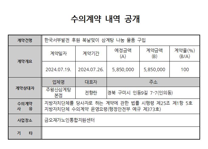 한국서부발전 후원 ‘복날맞이 삼계탕 나눔’ 구입 업체 선정 수의계약 내역 공개
