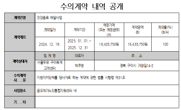 2025년 건강음료 배달사업 수의계약 공고 페이지 정보 작성자 관리자 댓글 0건 조회 1,486회 작성일 24-12-24 17:23 목록 본문 2025년 건강음료 배달사업 수의계약 공고 이전글밑반찬지원서비스 수의계약 내역 공개 24.12.31 다음글2025년 노인맞춤돌봄서비스사업 수행인력(생활지원사) 합격자 발표 24.12.11 댓글 0 댓글목록 등록된 댓글이 없습니다.