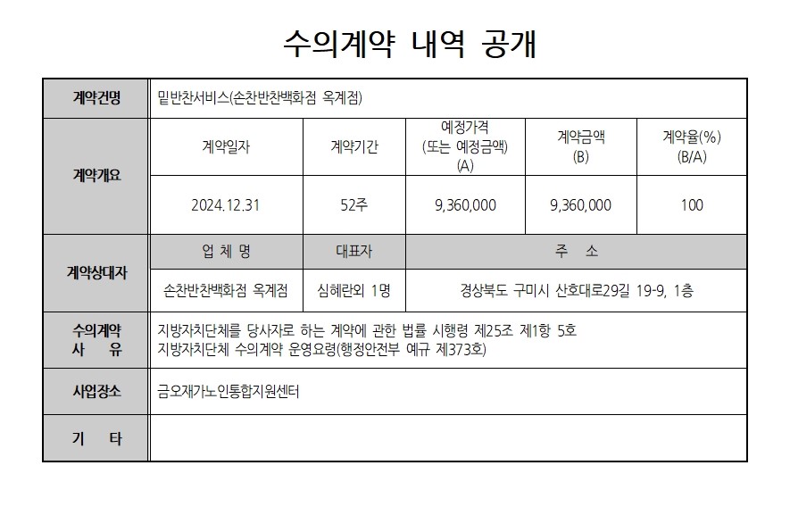 밑반찬지원서비스 수의계약 내역 공개 페이지 정보 작성자 관리자 댓글 0건 조회 1,559회 작성일 24-12-31 15:51 목록 본문 밑반찬지원서비스 수의계약 내역 공개 이전글한화시스템 후원 밑반찬 지원사업 수의계약 내역 공개 25.03.12 다음글2025년 건강음료 배달사업 수의계약 공고 24.12.24 댓글 0 댓글목록 등록된 댓글이 없습니다.