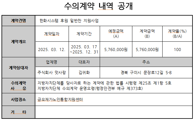 한화시스템 후원 밑반찬 지원사업 수의계약 내역 공개 페이지 정보 작성자 관리자 댓글 0건 조회 1,351회 작성일 25-03-12 17:53 목록 본문 밑반찬 수의계약 내역 이전글노인맞춤돌봄서비스사업 인지프로그램 수의계약 내역 공개 25.04.10 다음글밑반찬지원서비스 수의계약 내역 공개 24.12.31 댓글 0 댓글목록 등록된 댓글이 없습니다.