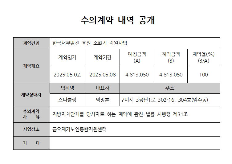 한국서부발전 후원 소화기 지원사업 업체 선정 수의계약 내역 공개 > 공지사항
